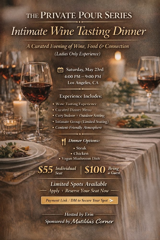 Welcome to the Private Pour Series, an intimate, invite-only wine tasting dinner curated for a small group of women who appreciate good wine, meaningful conversation, and elevated experiences.